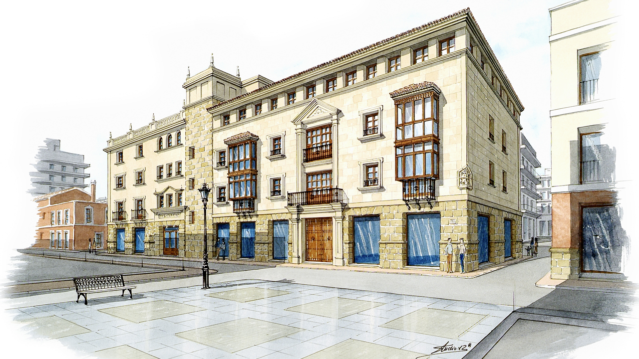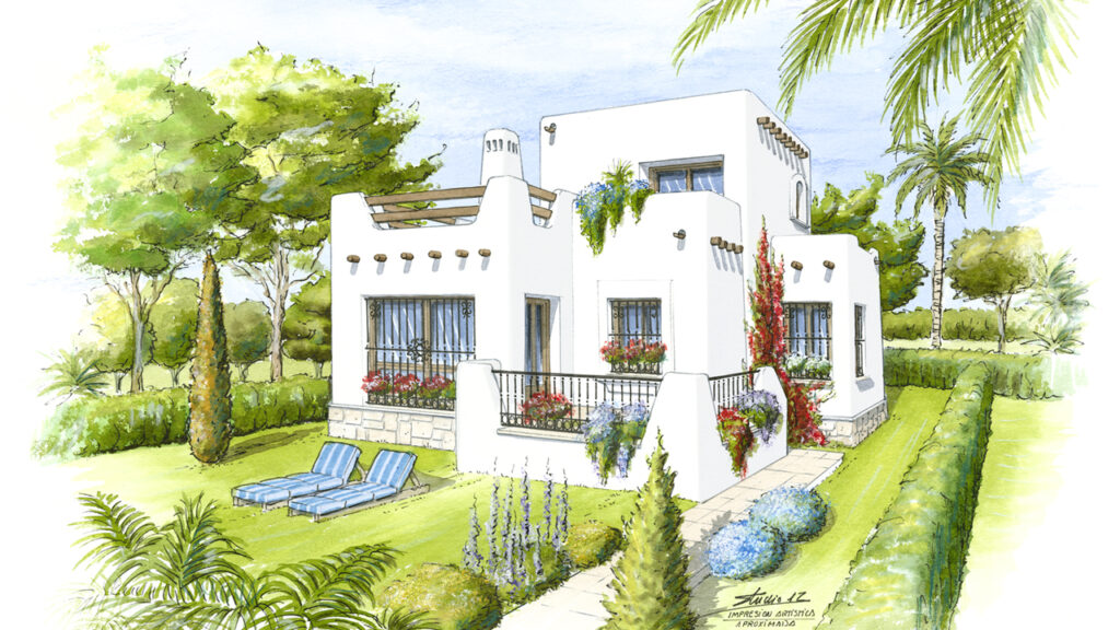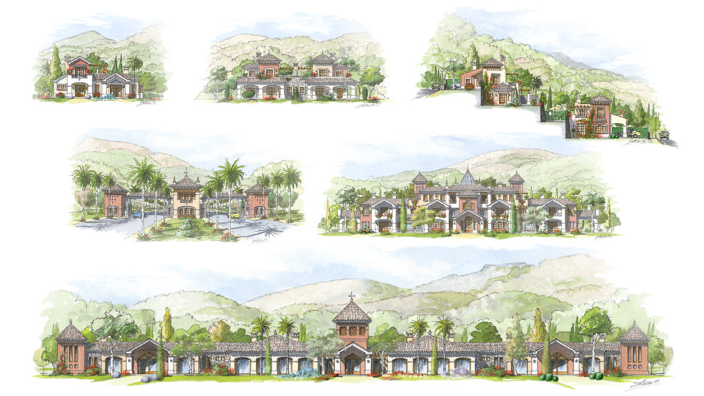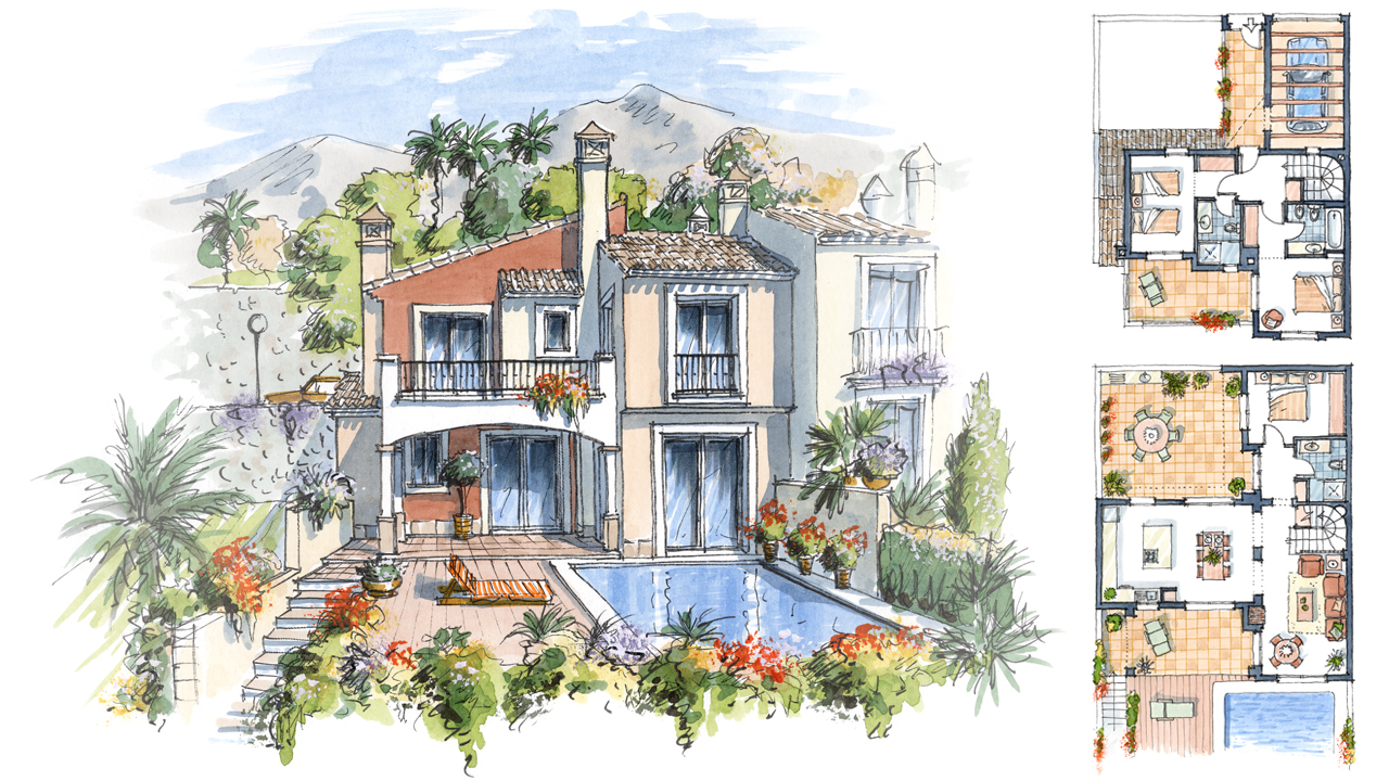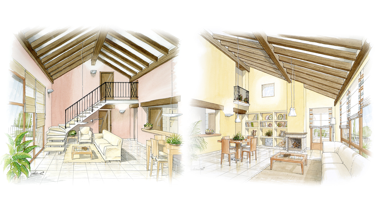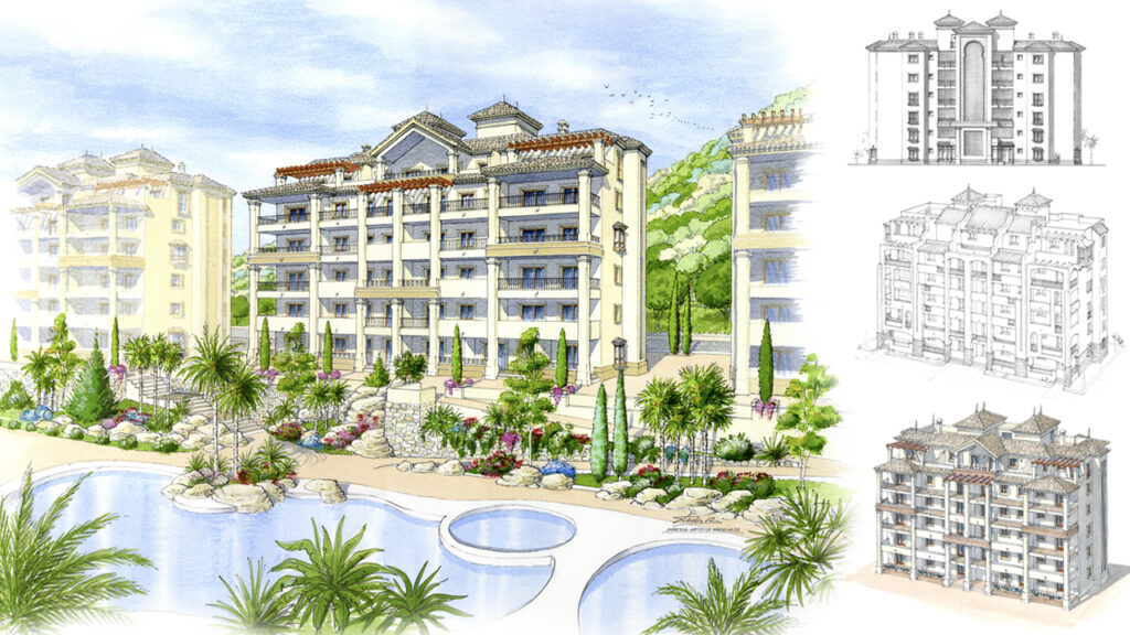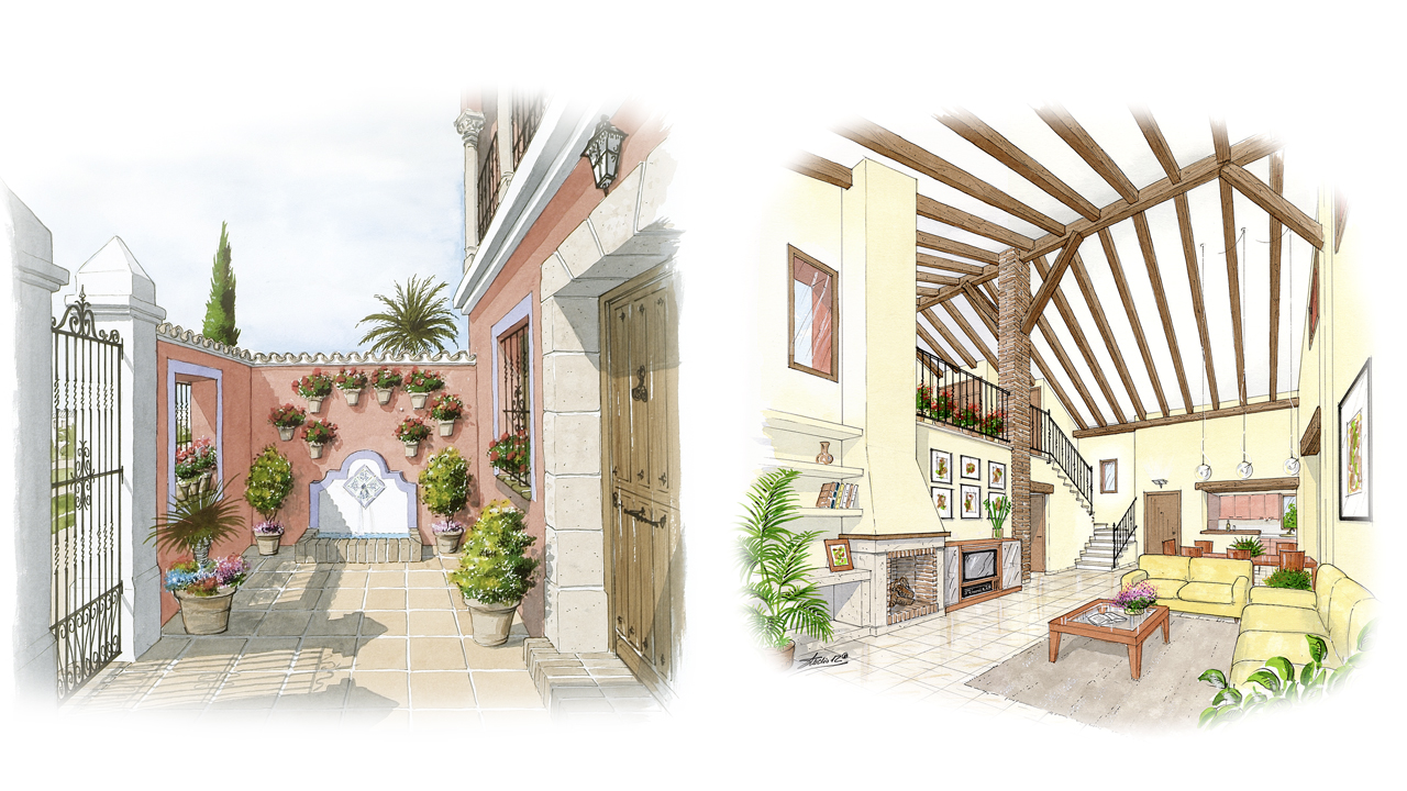 Perspectivas de diseño arquitectónico realizadas a mano alzada y acuarela.