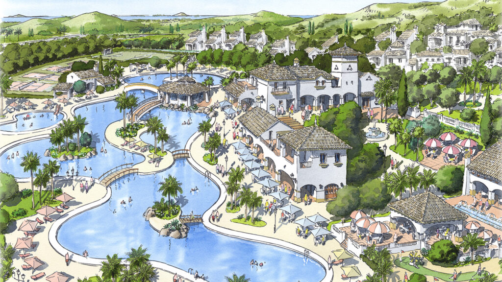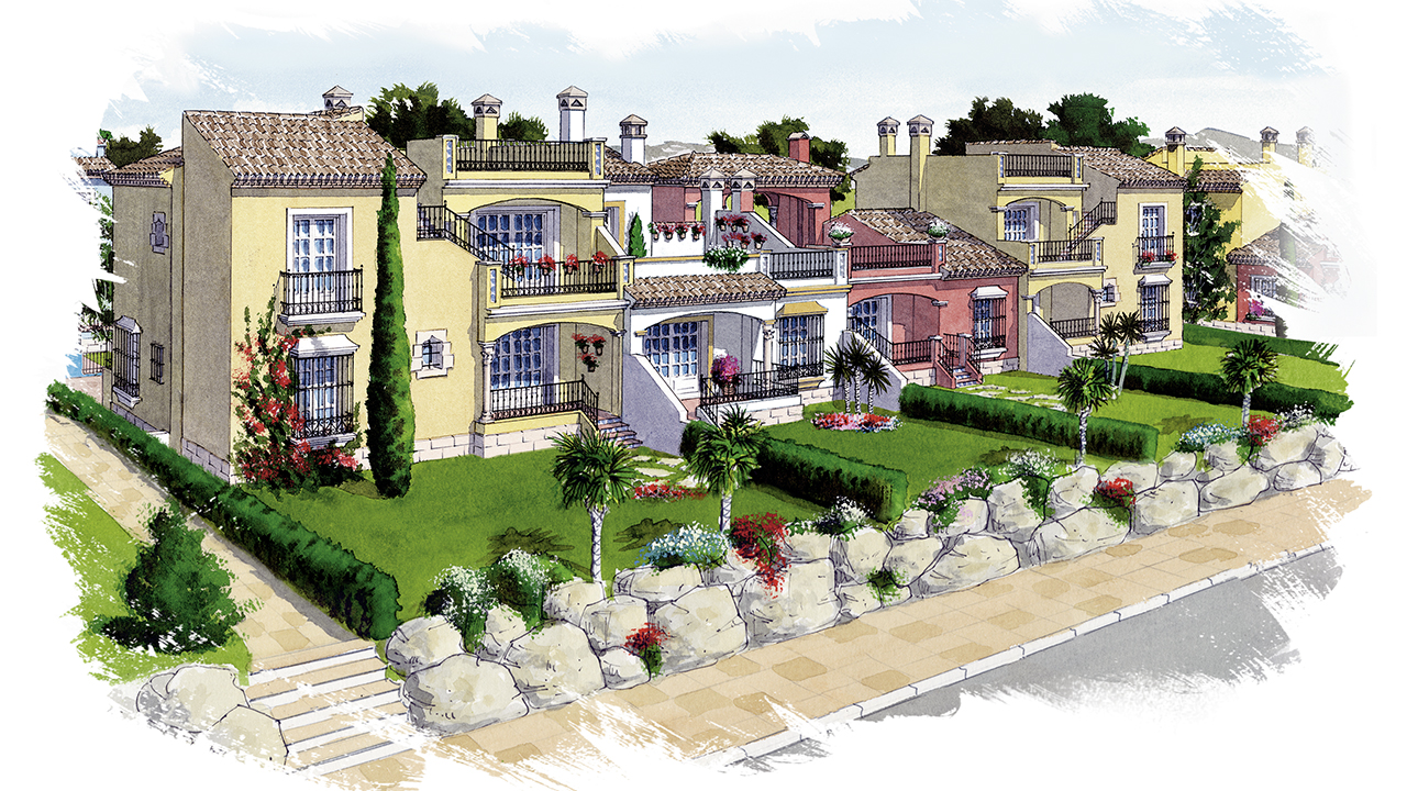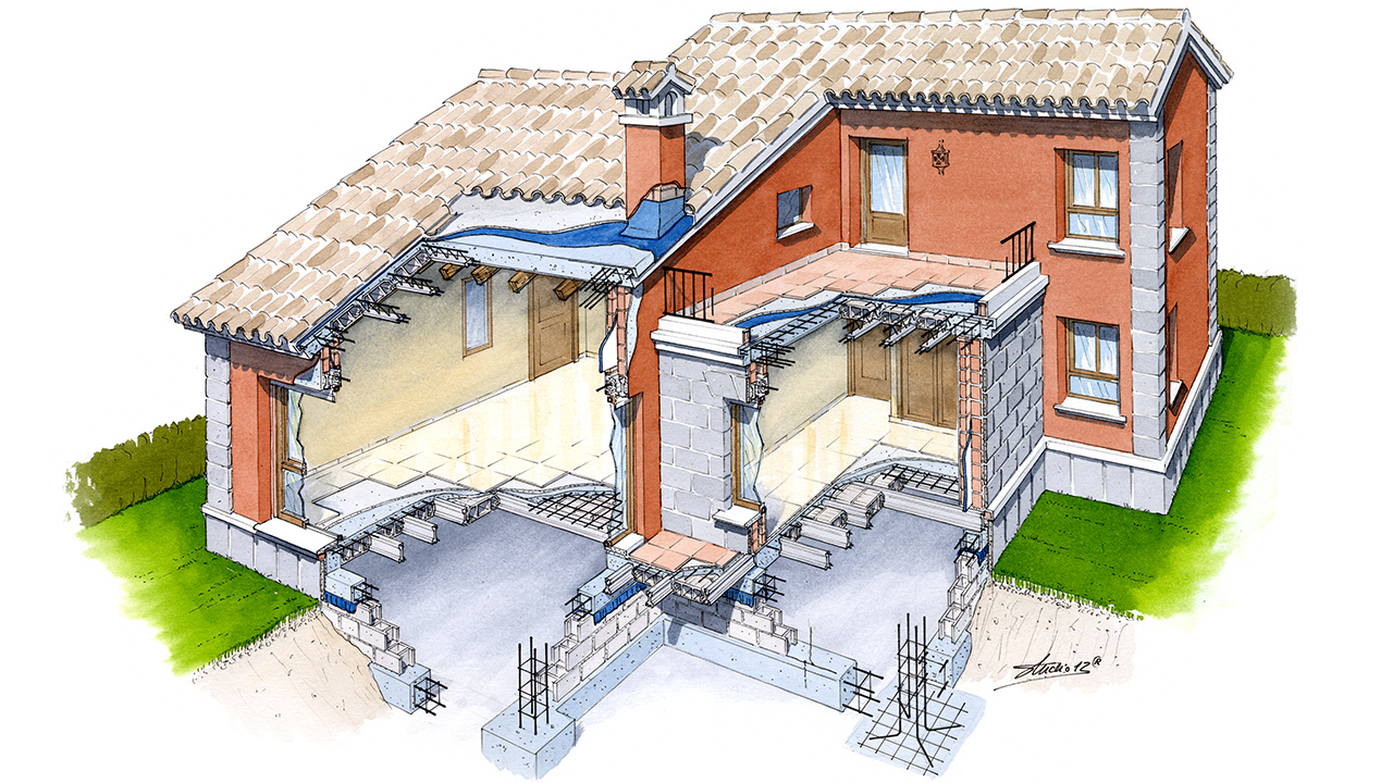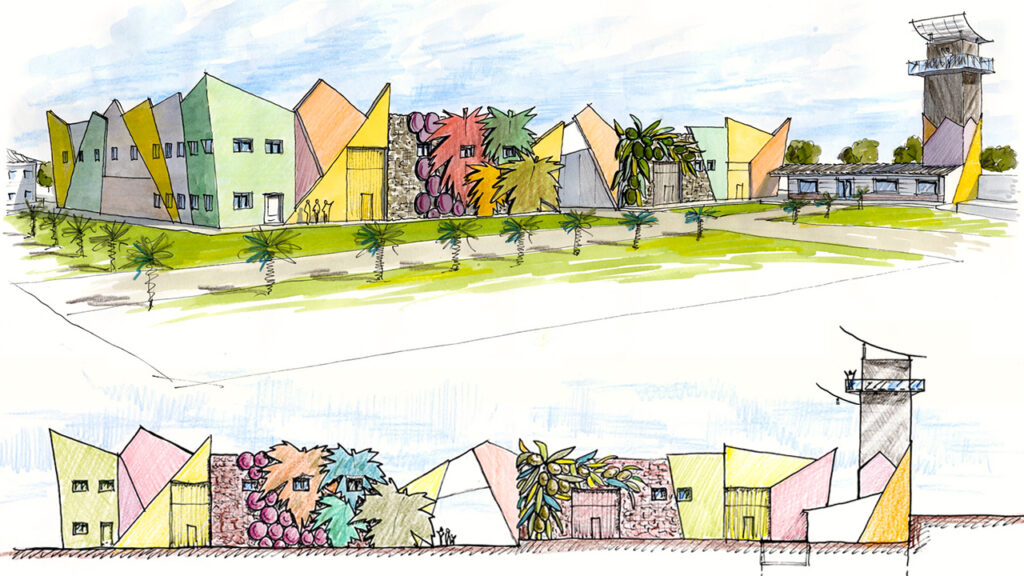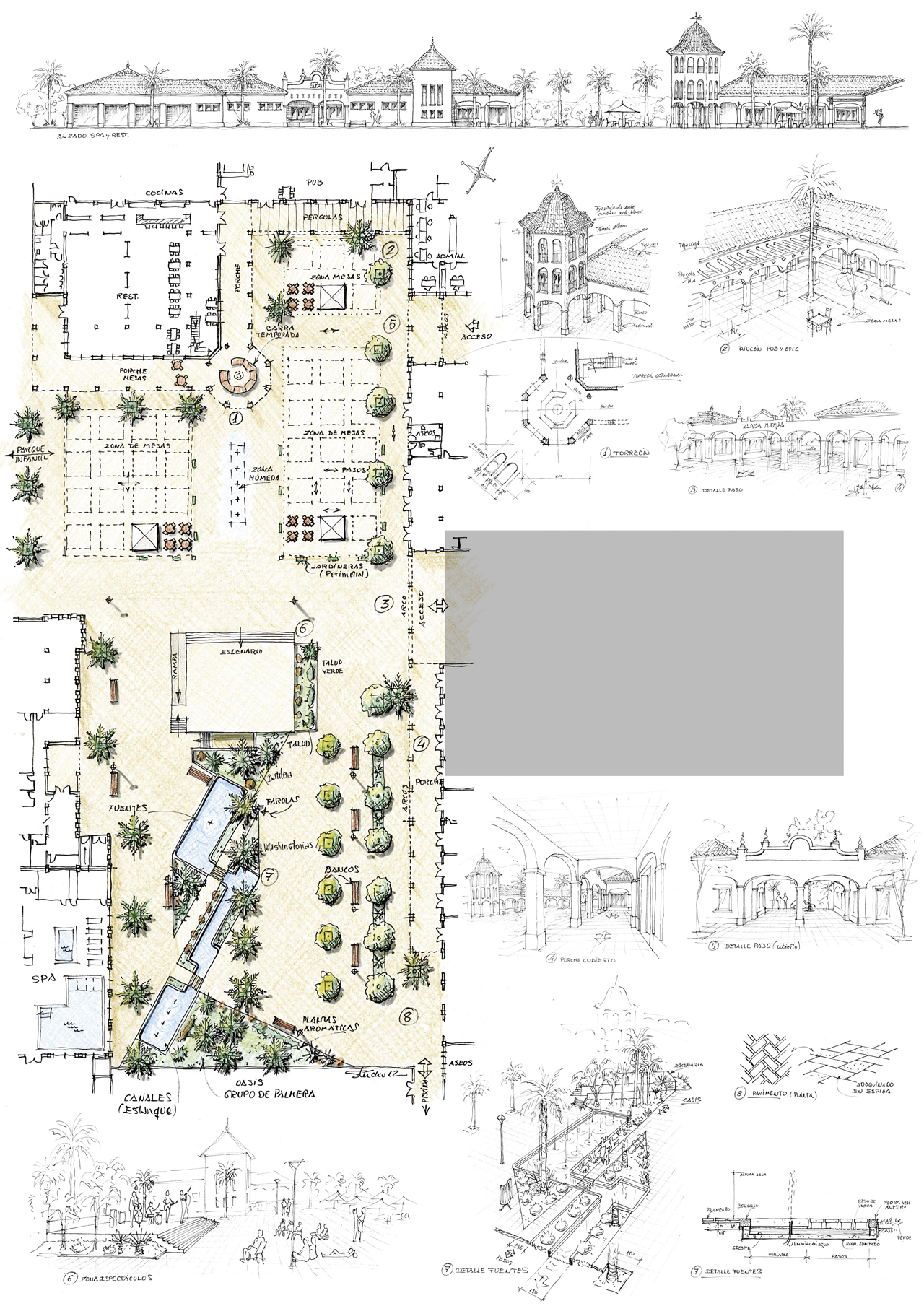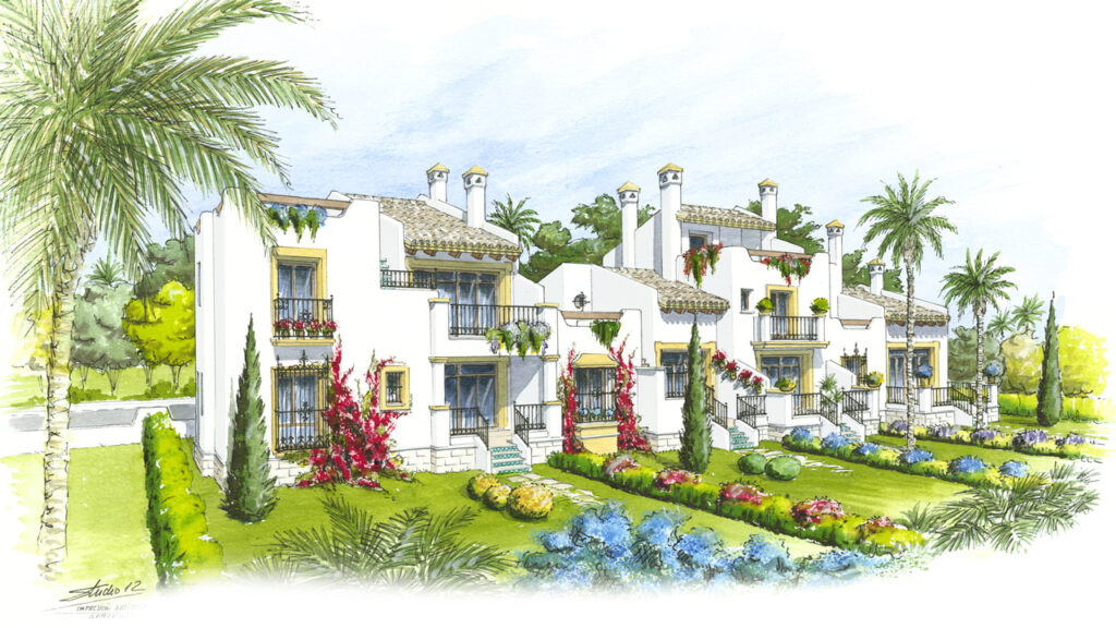 Perspectivas de diseño arquitectónico realizadas a mano alzada y acuarela.